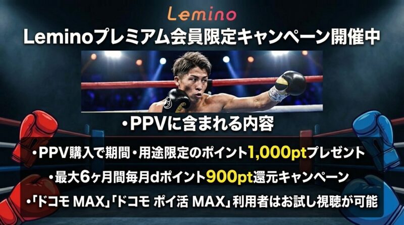 井上尚弥選手の歴史的な一戦を、お得に観戦したいと思いませんか。動画配信サービス「Lemino」では、プレミアム会員限定で非常にお得なキャンペーンを開催しています。PPVチケットの購入でdポイントが大量に還元されたり、特定の条件を満たすことでさらなる特典を受けられたりします。