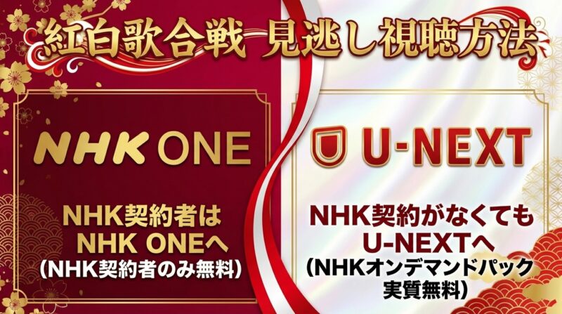 | U-NEXT(NHKオンデマンドパック) | アーカイブ配信あり | ・U-NEXT本体:月額2,189円(31日間無料体験あり) ・NHKオンデマンド利用料:月額990円 ・付与される1,000ポイント利用で紅白OKのNHKオンデマンド実質1ヶ月無料 |