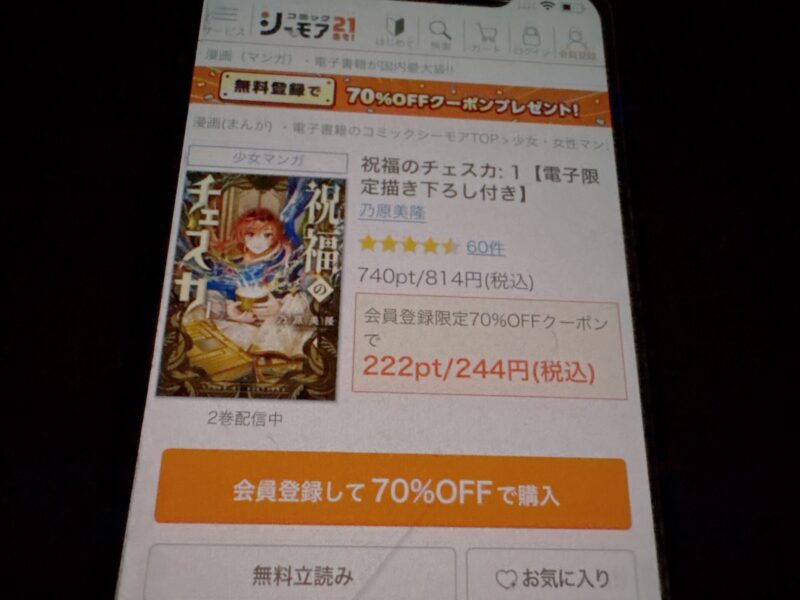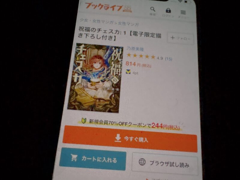 たとえば祝福のチェスカ1巻(税込814円)を購入する場合、クーポン利用で244円(税込)で購入できます。