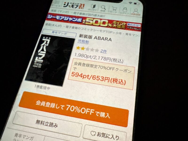 新規登録キャンペーンで「コミックシーモア2000」の申込みをすれば総獲得ポイントは2,450ポイントになるので、2,200円(2ヶ月分の料金)で「ABARA」全巻を購入できる計算になり大変お得です。
