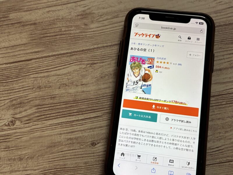 たとえばあひるの空1巻(税込594円)を購入する場合、クーポン利用で178円(税込)で購入できます。