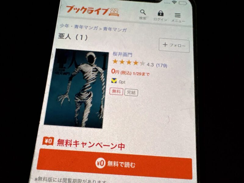 キャンペーンを利用すると、亜人を割安にまとめて購入したり、1巻だけ無料で購入することが可能です