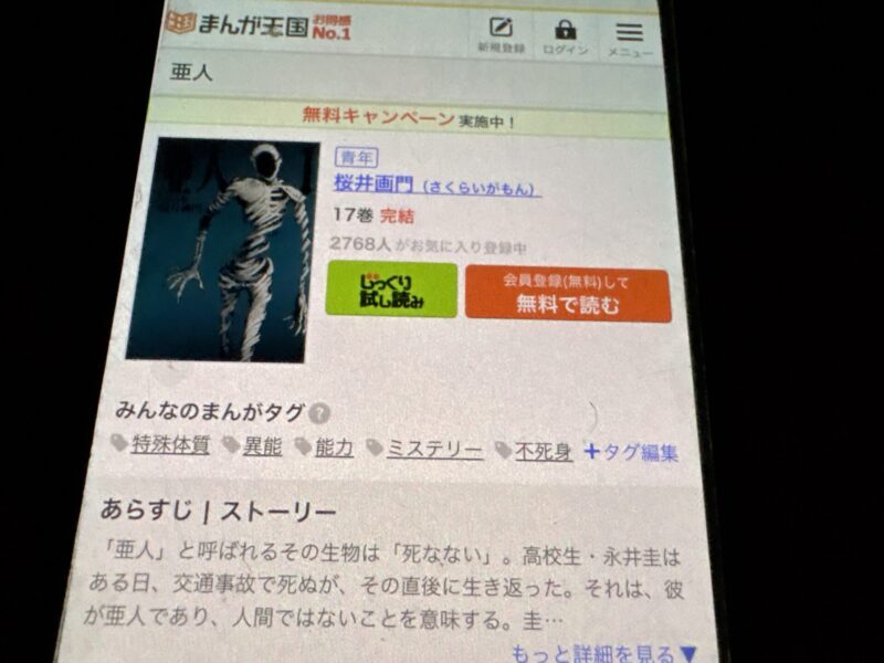 キャンペーンを利用することで一部の巻は無料で読めるため、お得に亜人漫画を全巻読むためには利用しましょう