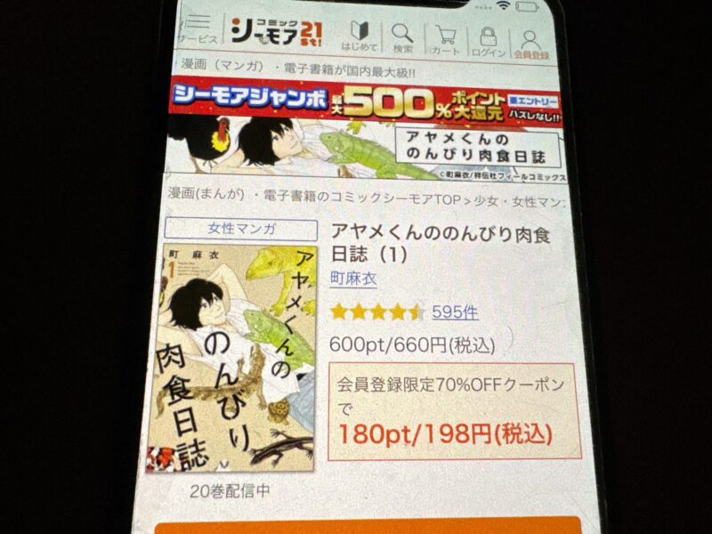 新規登録キャンペーンで「コミックシーモア5000」の申込みをすれば総獲得ポイントは12,400ポイントになるので、11,000円(2ヶ月分の料金)+150ポイントで「アヤメくんののんびり肉食日誌」全巻を購入できる計算になり大変お得です。