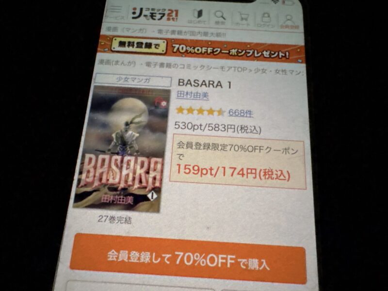 新規登録キャンペーンで「コミックシーモア5000」の申込みをすれば総獲得ポイントは17,400ポイントになるので、11,000円(2ヶ月分の料金)で「BASARA」全巻を購入できる計算になりお得です。