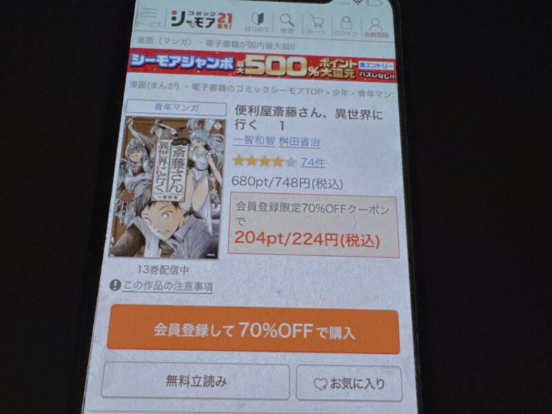 新規登録キャンペーンで「コミックシーモア5000」の申込みをすれば総獲得ポイントは12,400ポイントになるので、11,000円(2ヶ月分の料金)で「便利屋斎藤さん、異世界に行く」全巻を購入できる計算になり大変お得です。