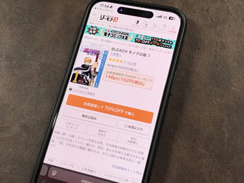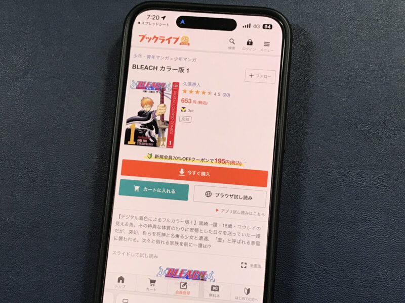 たとえばBLEACH1巻(税込543円)を購入する場合、クーポン利用で163円(税込)で購入できます。