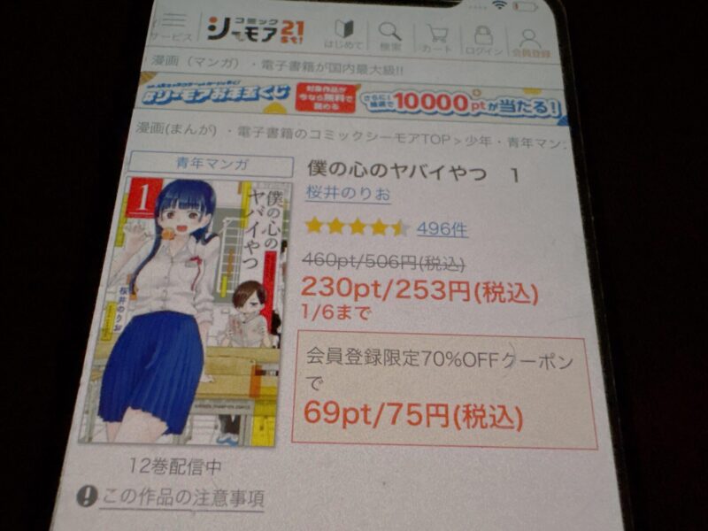 僕の心のヤバイやつの場合、全12巻までを5,604ポイントで購入できます。
