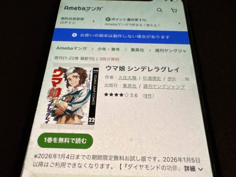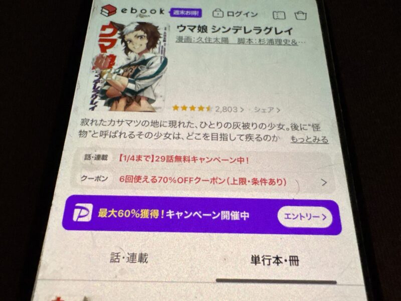 キャンペーンを利用することで一部の巻は無料で読めるため、お得にウマ娘 シンデレラグレイ漫画を全巻読むためには利用しましょう。