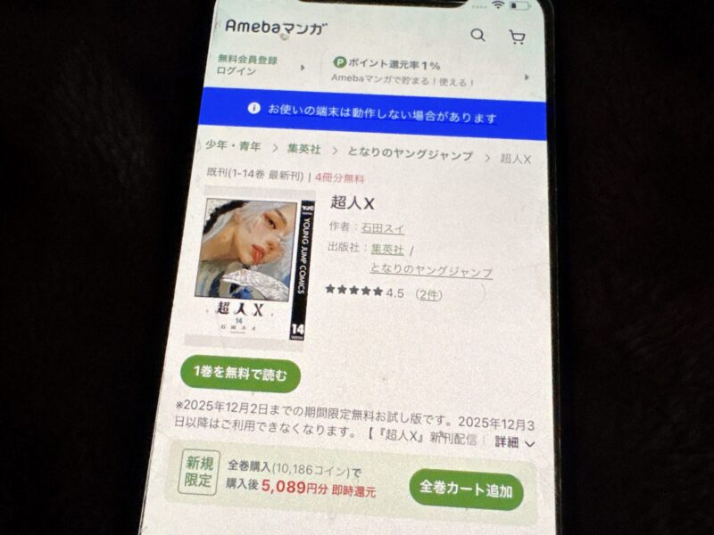 キャンペーンを利用することで一部の巻は無料で読めるため、お得に超人X漫画を全巻読むためには利用しましょう。