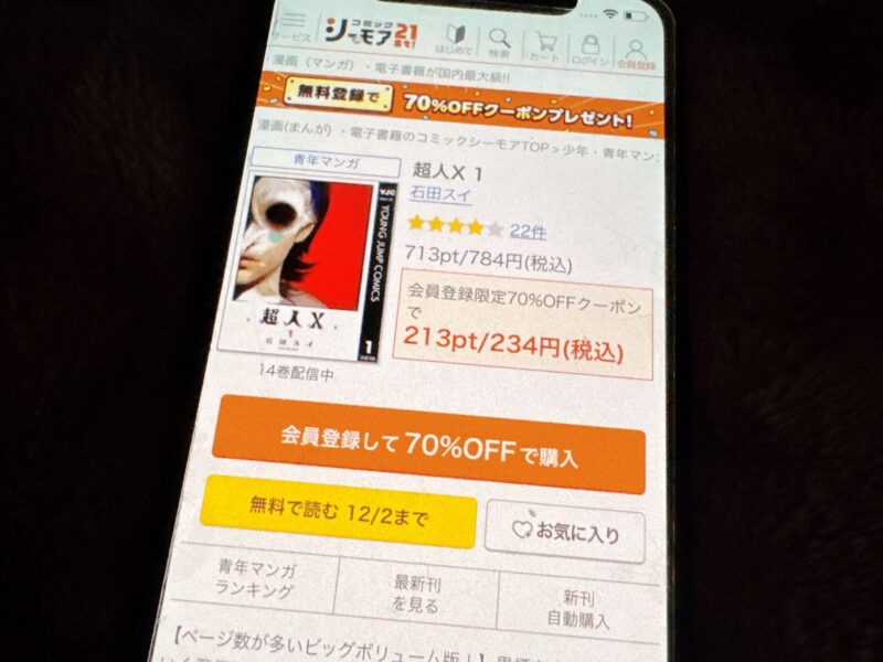 たとえば超人X1巻(税込784円)を購入する場合、70%クーポン利用で700円引きが適用され、235円(税込)で購入できます。