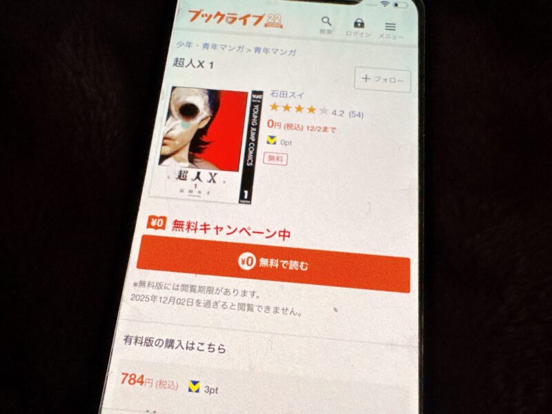 キャンペーンを利用すると、超人Xを割安にまとめて購入したり、1巻だけ無料で購入することが可能です。