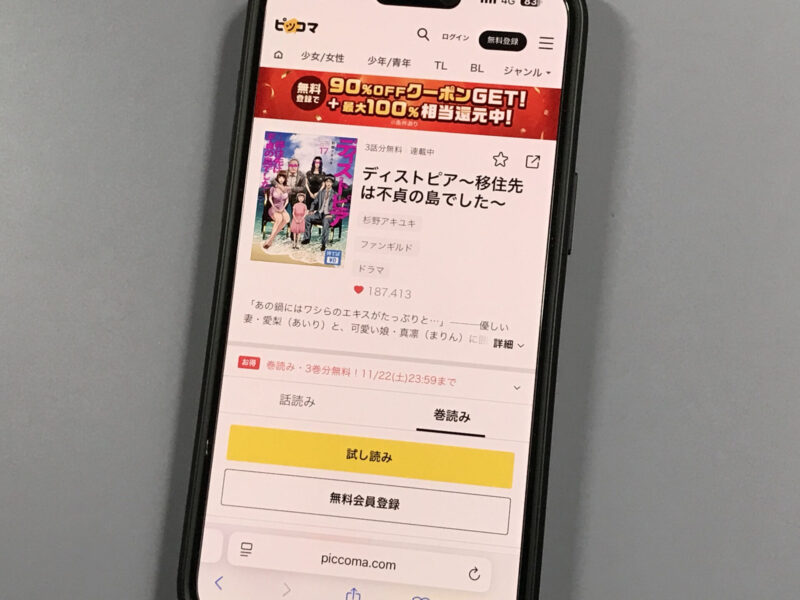 「ピッコマ」では、期間限定で「ディストピア~移住先は不貞の島でした~」の無料キャンペーンを実施していることがあります。