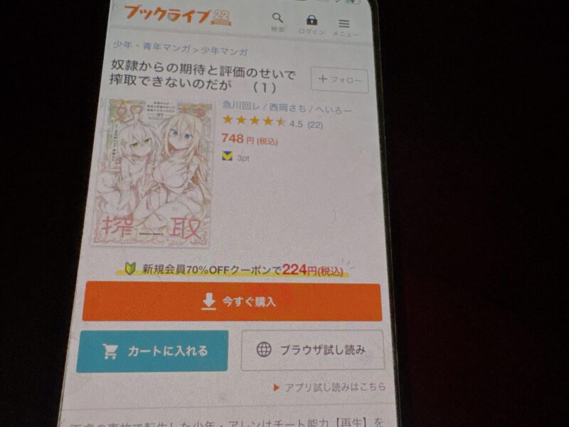 たとえば奴隷からの期待と評価のせいで搾取できないのだが1巻(税込748円)を購入する場合、クーポン利用で224円(税込)で購入できます。