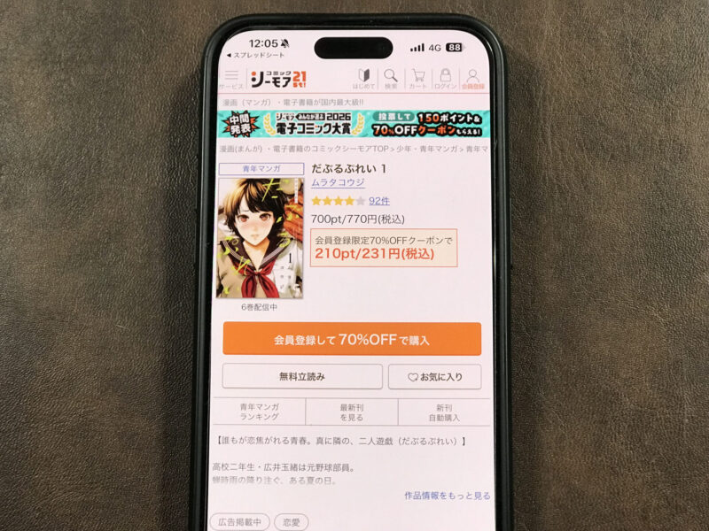また、ブックライブは会員登録するだけで1冊限定の70%オフクーポンがもらえます。