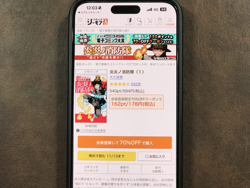 たとえば炎炎ノ消防隊1巻(税込594円)を購入する場合、クーポン利用で178円(税込)で購入できます。