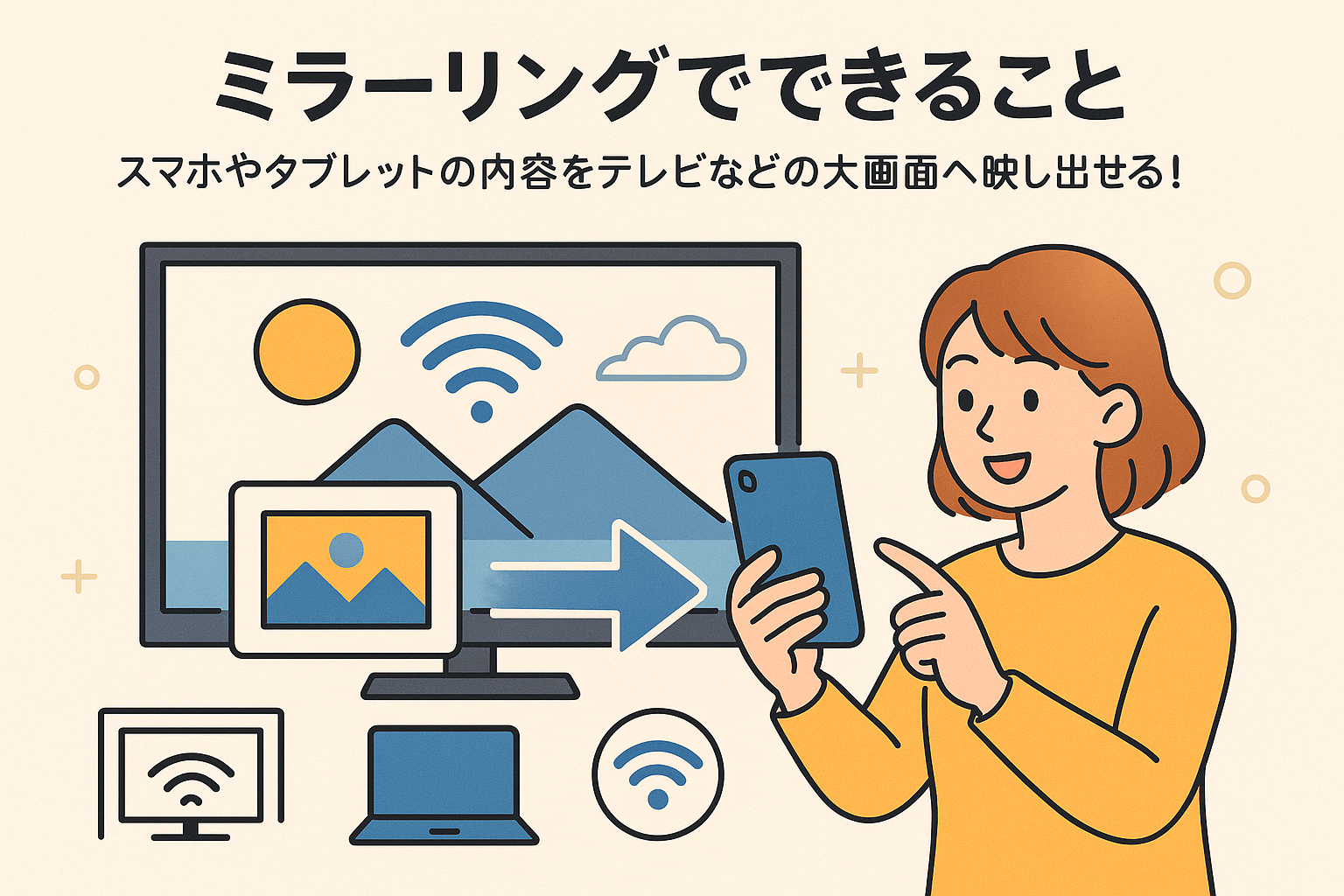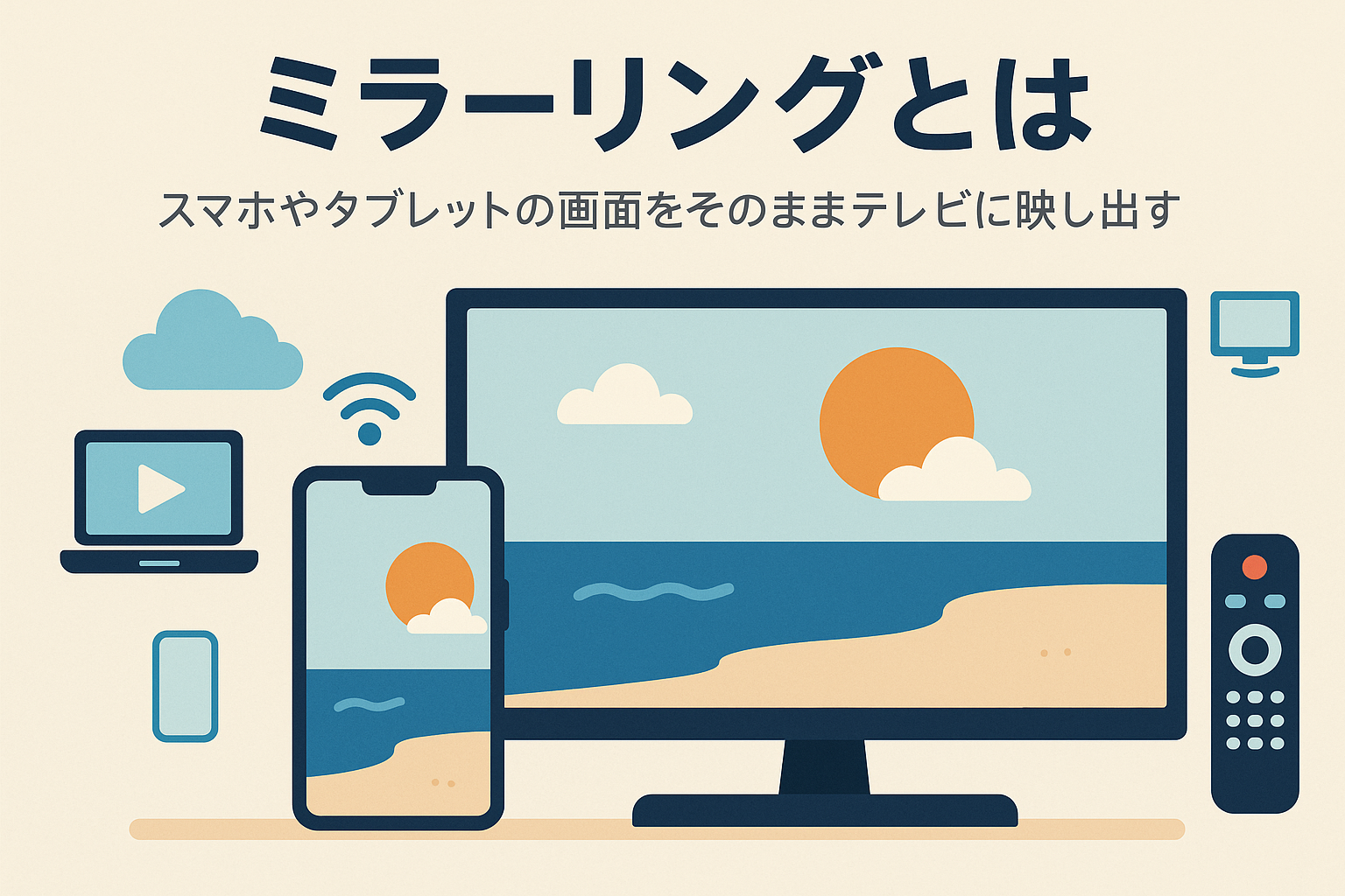 ミラーリングとは、スマートフォンやタブレットの画面に表示されている内容を、そのままテレビなどの大きなディスプレイにワイヤレスで映し出す機能です。主に「Miracast(ミラキャスト)」といった無線通信技術を利用し、映像や音声をリアルタイムで転送します。