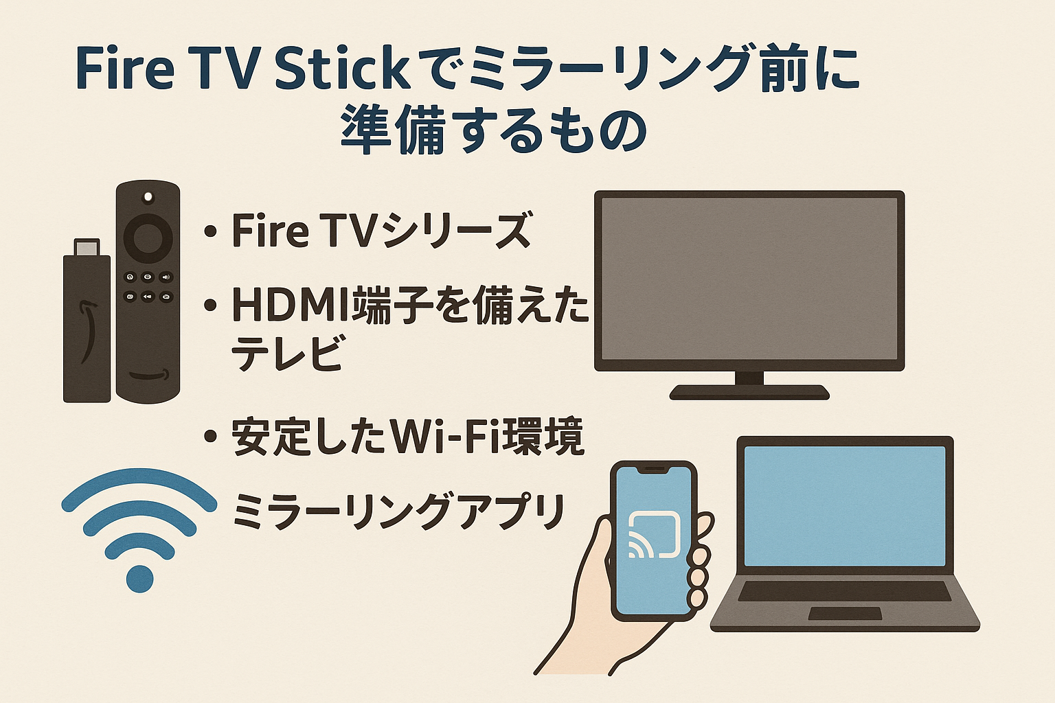Fire TV Stickでミラーリング機能をご利用いただくためには、Fire TV Stick本体のほかに、HDMI入力端子を備えたテレビ(またはモニター)と、安定したWi-Fi接続環境をご用意ください。
