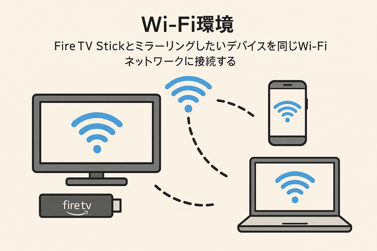 iPhone、Androidスマホ、Windowsパソコン、iMac、MacBookのいずれかの画面をFire TV Stickにミラーリングする場合、デバイスとFire TV Stickが同じWi-Fiネットワークに接続されている必要があります