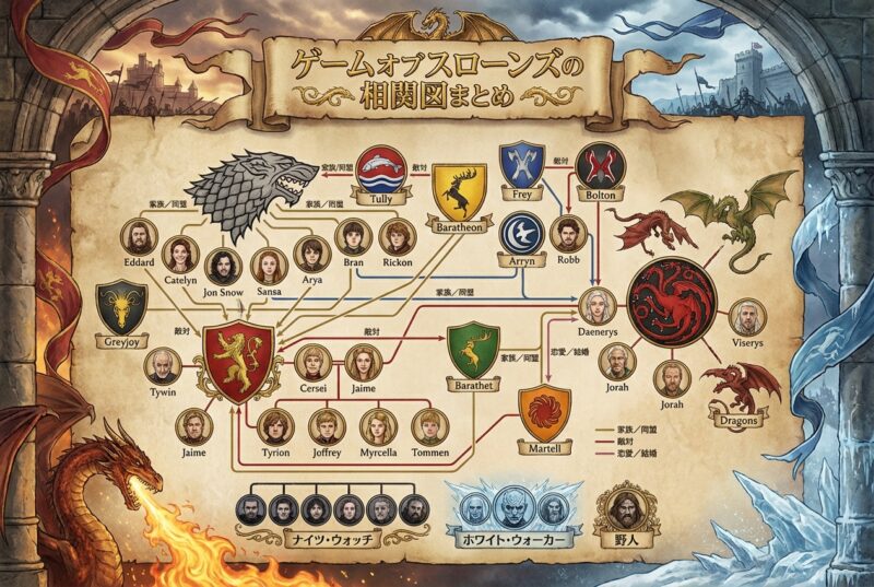 最初は覚えることが多くて大変かもしれませんが、人間関係を理解すればするほど、このドラマの深みにハマること間違いなしです。ぜひこの記事を参考に、ウェスタロスの壮大な歴史とドラマチックな運命の物語を楽しんでください。