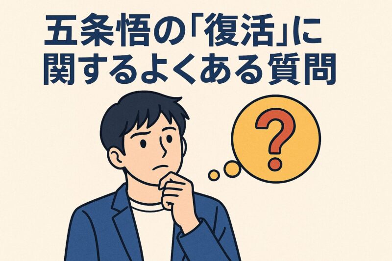 五条悟の「復活」は、非常に特殊で複雑な経緯を辿っているため、多くの疑問を持つファンもいるでしょう。ここでは、彼の復活に関して特に多く寄せられる質問について、原作の情報を基に分かりやすく回答していきます。