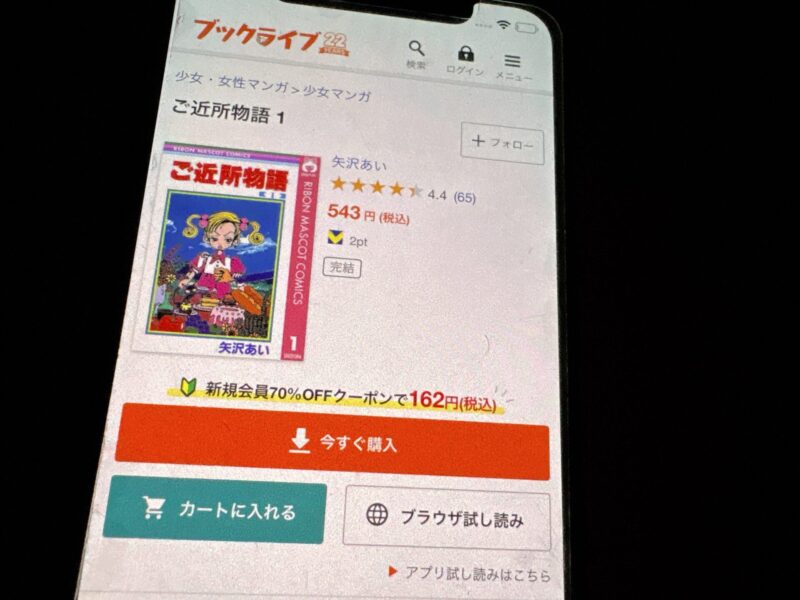 新規登録キャンペーンで「コミックシーモア2000」の申込みをすれば総獲得ポイントは4900ポイントになるので、4,400円(2ヶ月分の料金)で「ご近所物語」全巻を購入できる計算になりお得です。