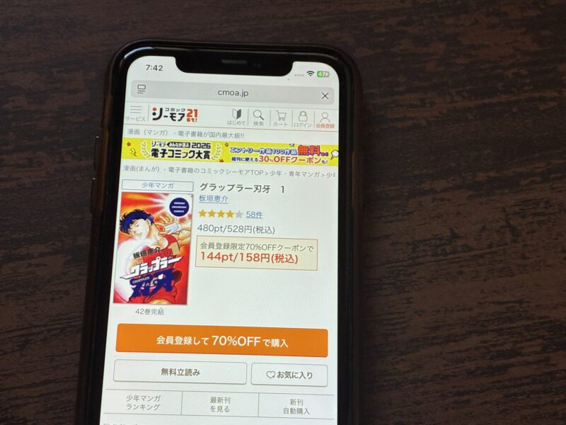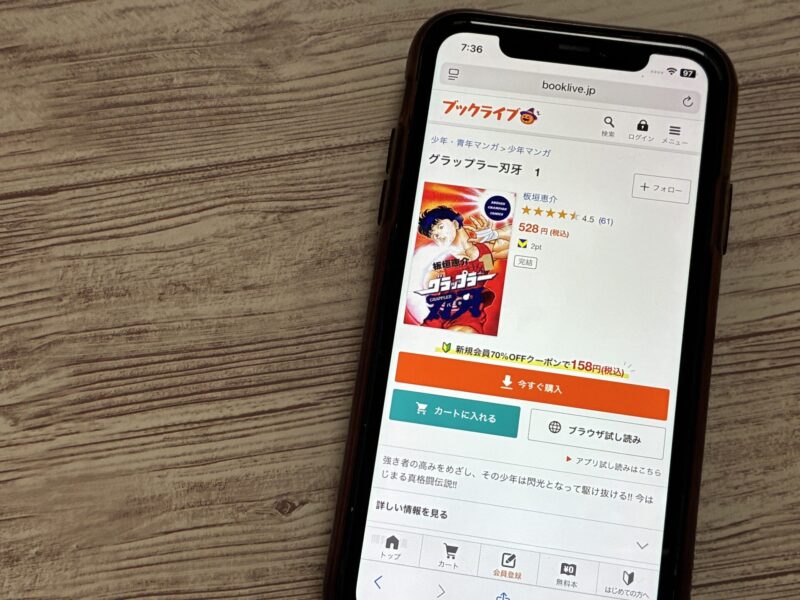 たとえばグラップラー刃牙1巻(税込528円)を購入する場合、クーポン利用で158円(税込)で購入できます。