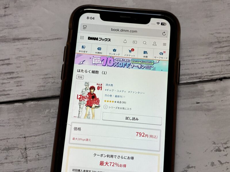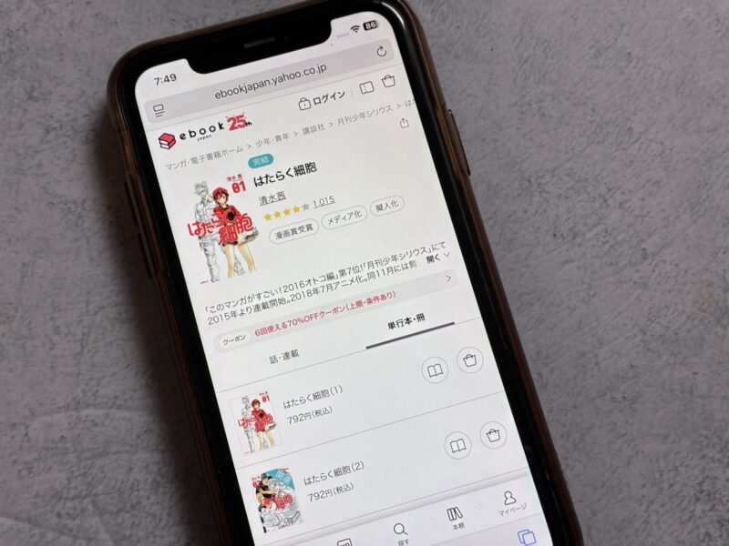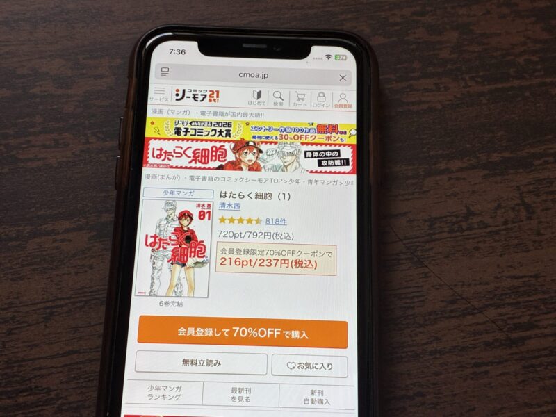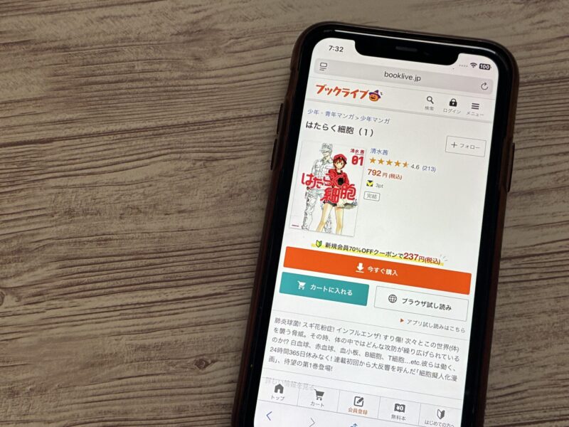 たとえばはたらく細胞1巻(税込792円)を購入する場合、クーポン利用で238円(税込)で購入できます。