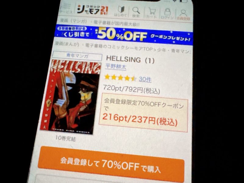 たとえばHELLSING1巻(税込792円)を購入する場合、クーポン利用で238円(税込)で購入できます。