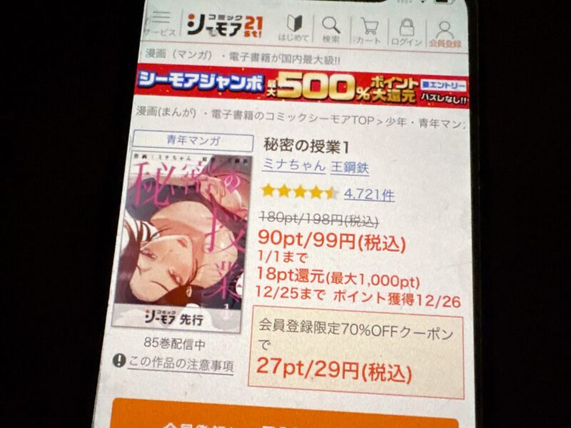新規登録キャンペーンで「コミックシーモア10000」の申込みをすれば総獲得ポイントは12,500ポイントになるので、11,000円(1ヶ月分の料金)で「秘密の授業」ほぼ全巻を購入できる計算になり大変お得です。