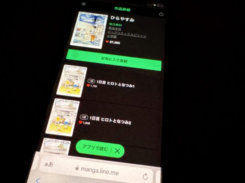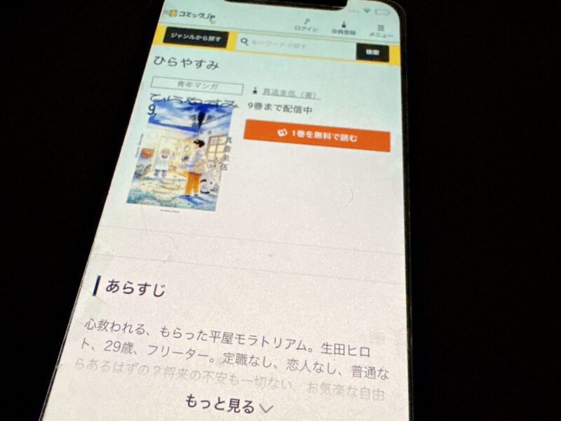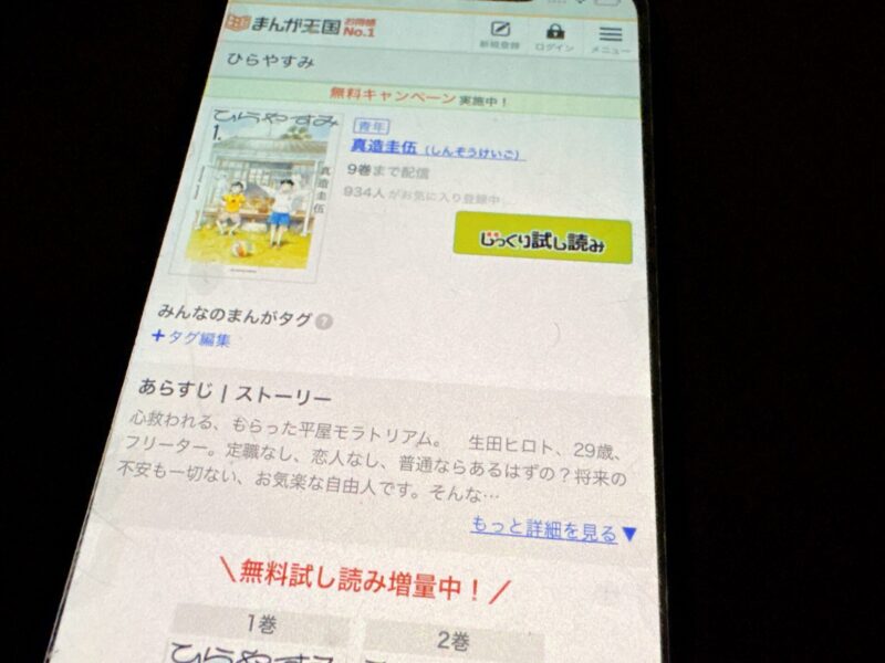 ひらやすみはまるごと無料では読めませんが、1巻・2巻が期間限定無料で読めるほか、3巻以降も試し読みはできます。