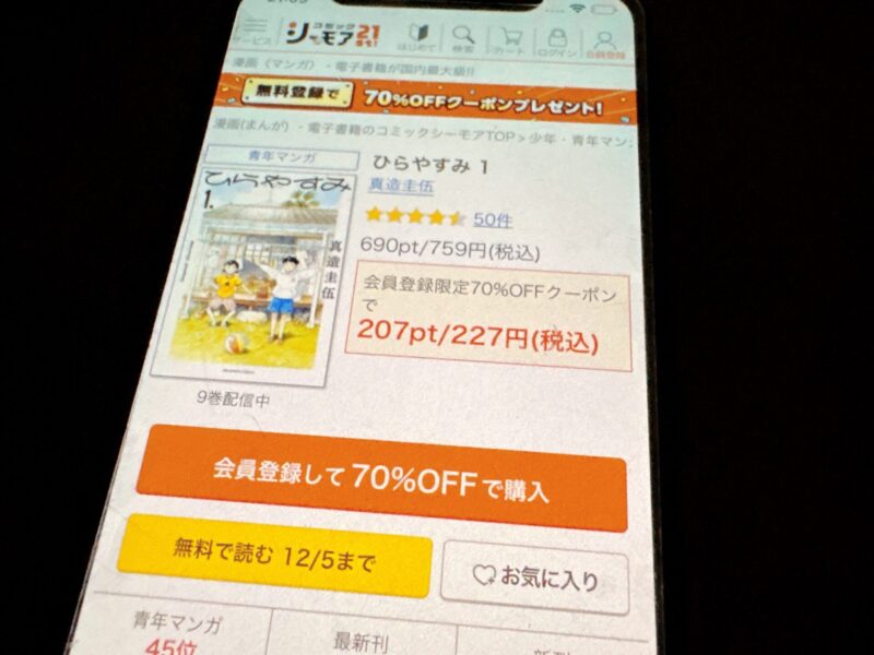 たとえばひらやすみ1巻(税込759円)を購入する場合、クーポン利用で228円(税込)で購入できます。現在1・2巻は無料キャンペーン中です。