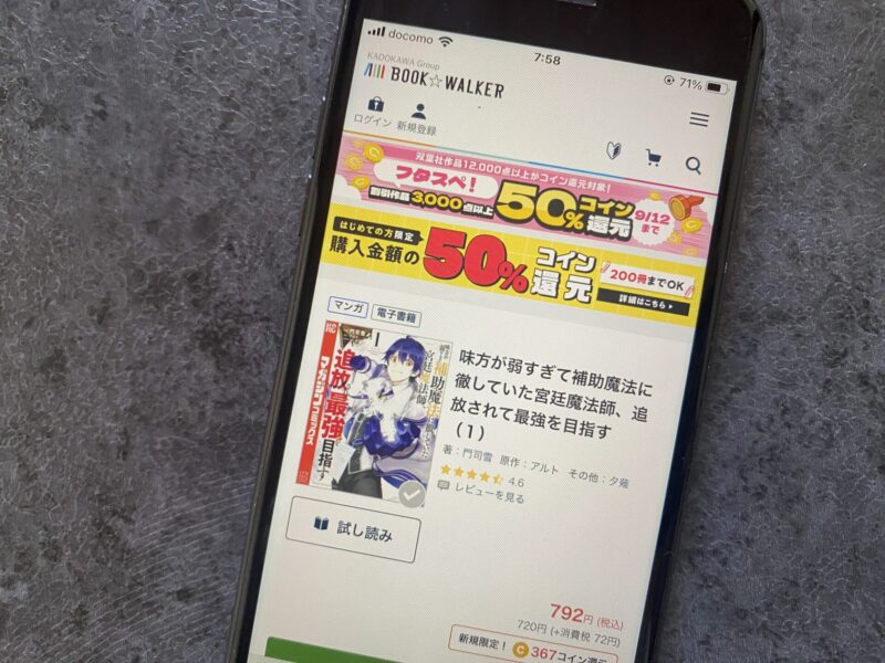 キャンペーンを利用すると、味方が弱すぎて補助魔法に徹していた宮廷魔法師、追放されて最強を目指すを割安にまとめて購入したり、1巻だけ無料で購入することが可能です。