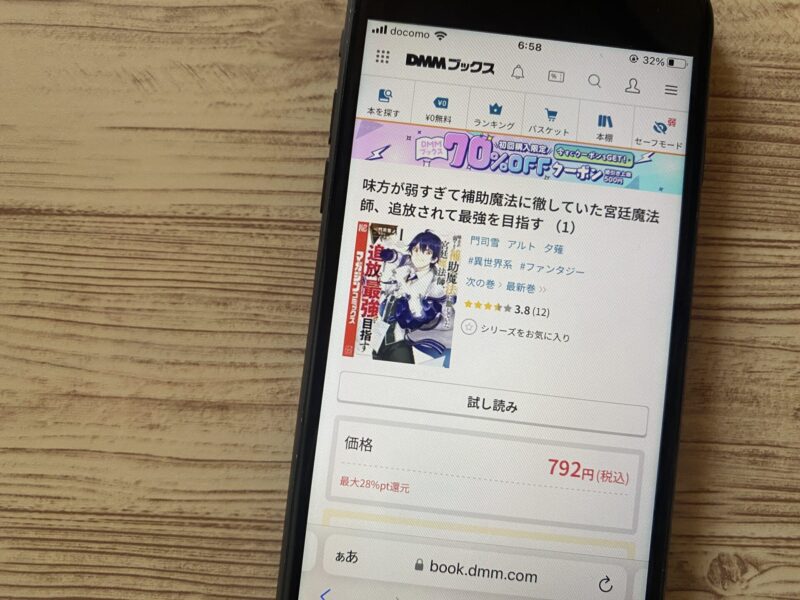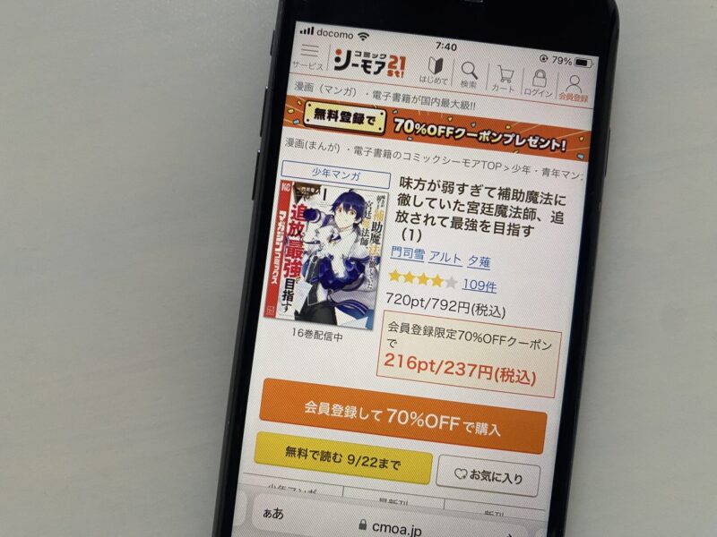 たとえば味方が弱すぎて補助魔法に徹していた宮廷魔法師、追放されて最強を目指す1巻(税込792円)を購入する場合、クーポン利用で238円(税込)で購入できます。