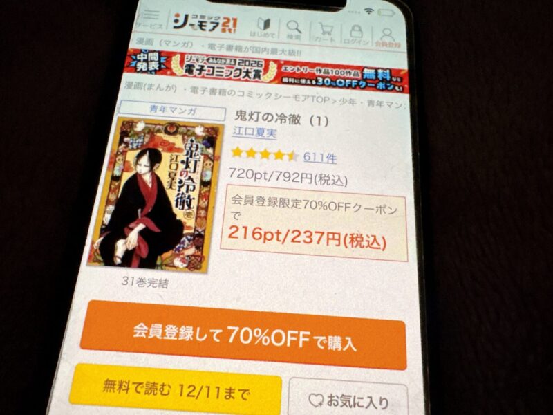 たとえば鬼灯の冷徹1巻(税込792円)を購入する場合、クーポン利用で238円(税込)で購入できます。