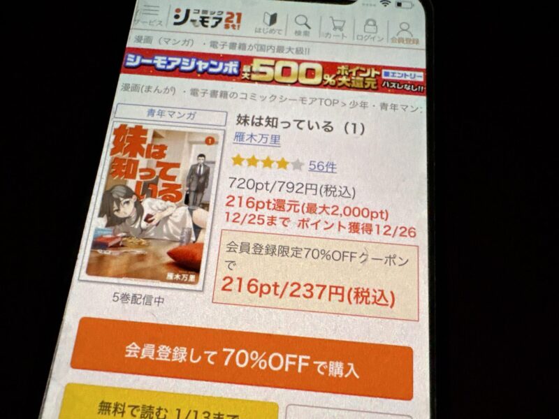 キャンペーンを利用すると、妹は知っているを割安にまとめて購入したり、1巻だけ無料で購入することが可能です。