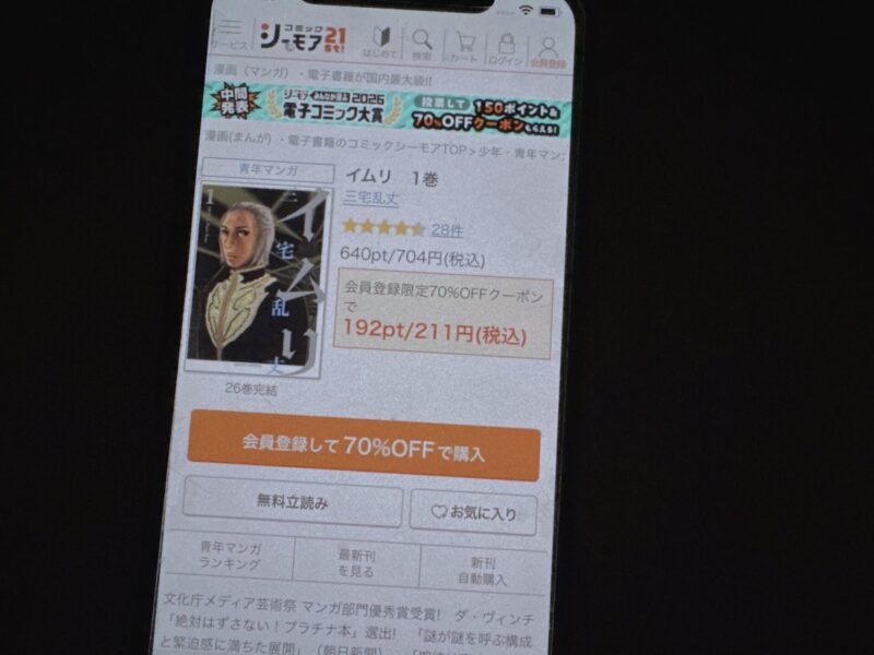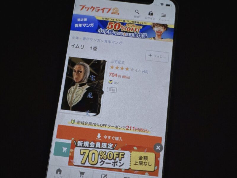 たとえばイムリ1巻(税込704円)を購入する場合、クーポン利用で211円(税込)で購入できます。