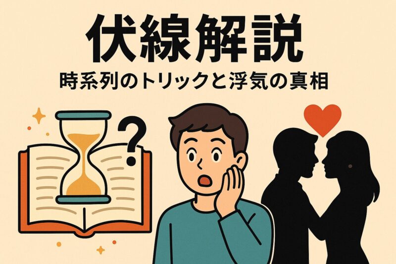 ここでは、物語の根幹をなす「時系列のズレ」と「本当の浮気の真相」について、具体的な伏線を挙げながら解説していきます。これらのポイントを知ることで、作品への理解がさらに深まるはずです。