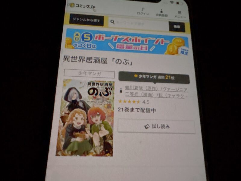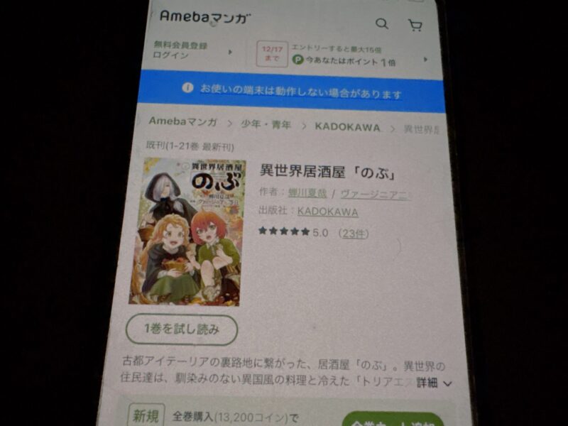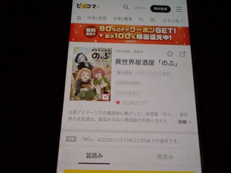 キャンペーンを利用することで一部の巻は無料で読めるため、お得に異世界居酒屋「のぶ」漫画を全巻読むためには利用しましょう。