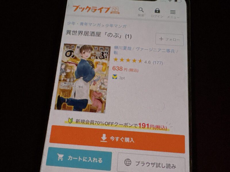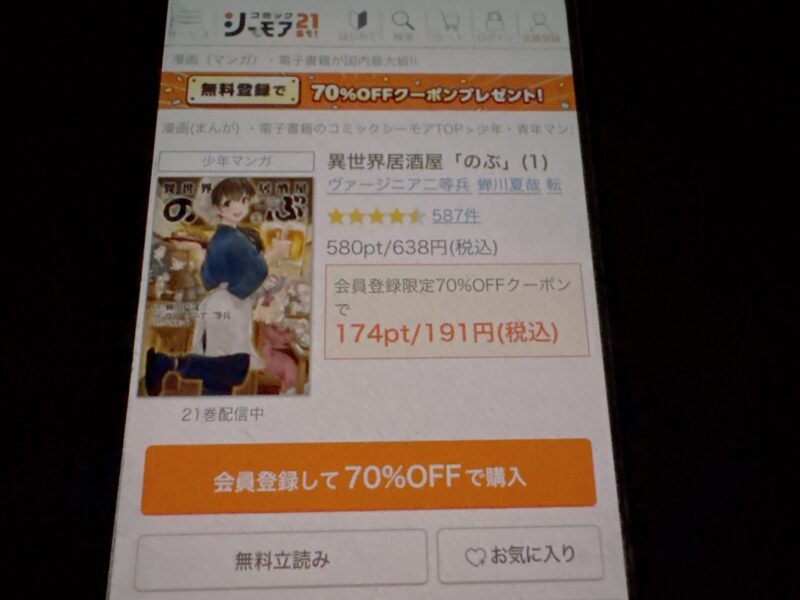 たとえば異世界居酒屋「のぶ」1巻(税込638円)を購入する場合、クーポン利用で191円(税込)で購入できます。