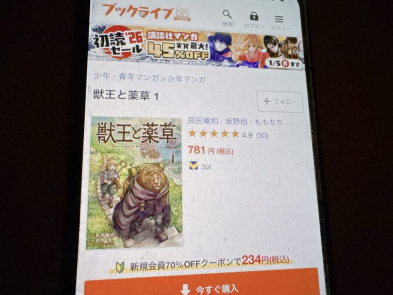 キャンペーンを利用すると、獣王と薬草を割安にまとめて購入したり、1巻だけ無料で購入することが可能です。