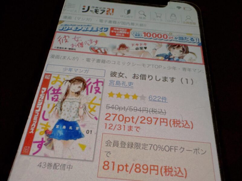 新規登録キャンペーンで「コミックシーモア20000」の申込みをすれば総獲得ポイントは26,000ポイントになるので、22,000円(2ヶ月分の料金)で「彼女、お借りします」全巻を購入できる計算になり大変お得です。