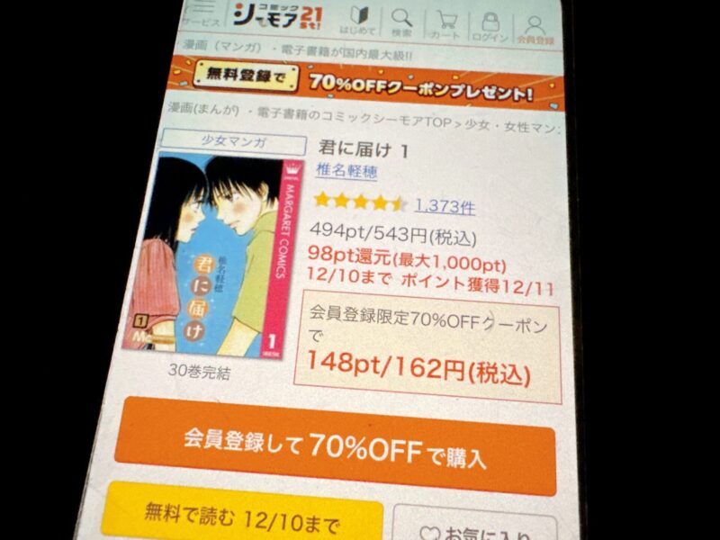 たとえば君に届け1巻(税込543円)を購入する場合、クーポン利用で163円(税込)で購入できます。