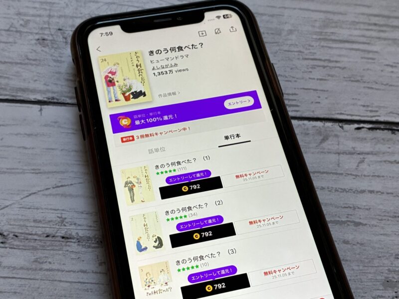 キャンペーンを利用すると、きのう何食べた?を割安にまとめて購入したり、1巻だけ無料で購入することが可能です。