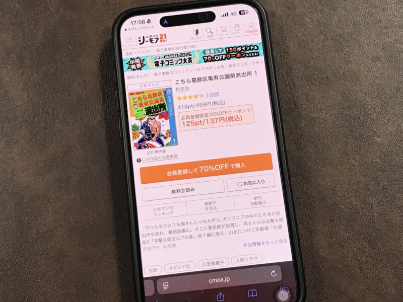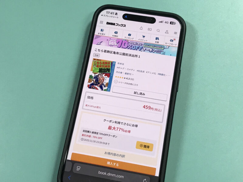 たとえばこちら葛飾区亀有公園前派出所1巻(税込459円)を購入する場合、クーポン利用で138円(税込)で購入できます。