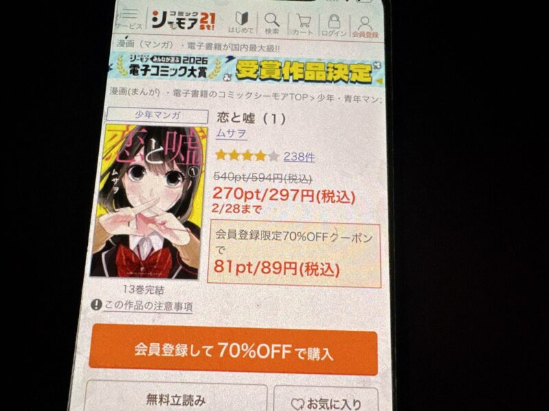 キャンペーンを利用すると、恋と嘘を割安にまとめて購入したり、1巻だけ無料で購入することが可能です