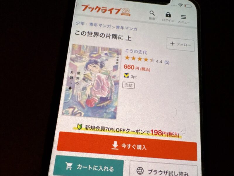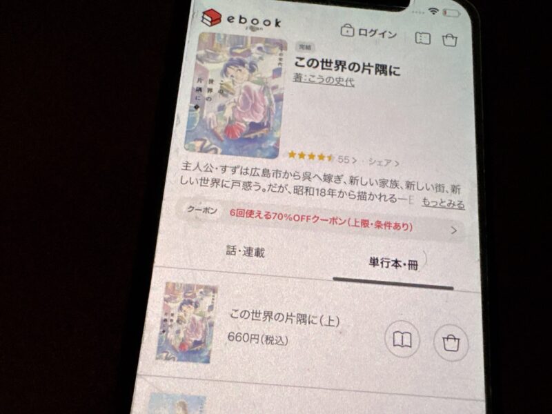 キャンペーンを利用すると、この世界の片隅にを割安にまとめて購入したり、1巻だけ無料で購入することが可能です。