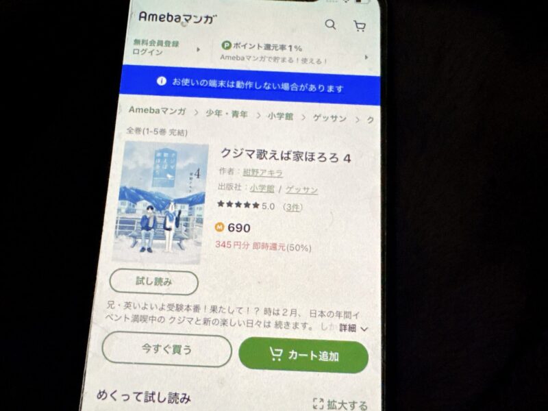 キャンペーンを利用することで一部の巻は無料で読めるため、お得にクジマ歌えば家ほろろ漫画を全巻読むためには利用しましょう。