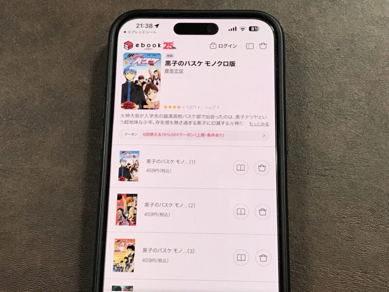 たとえば黒子のバスケ1巻(税込459円)を購入する場合、クーポン利用で138円(税込)で購入できます。