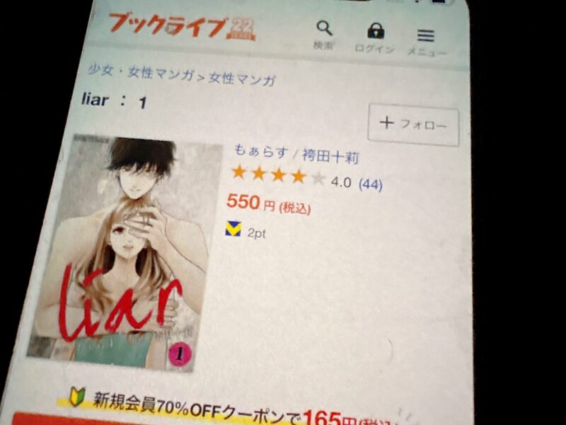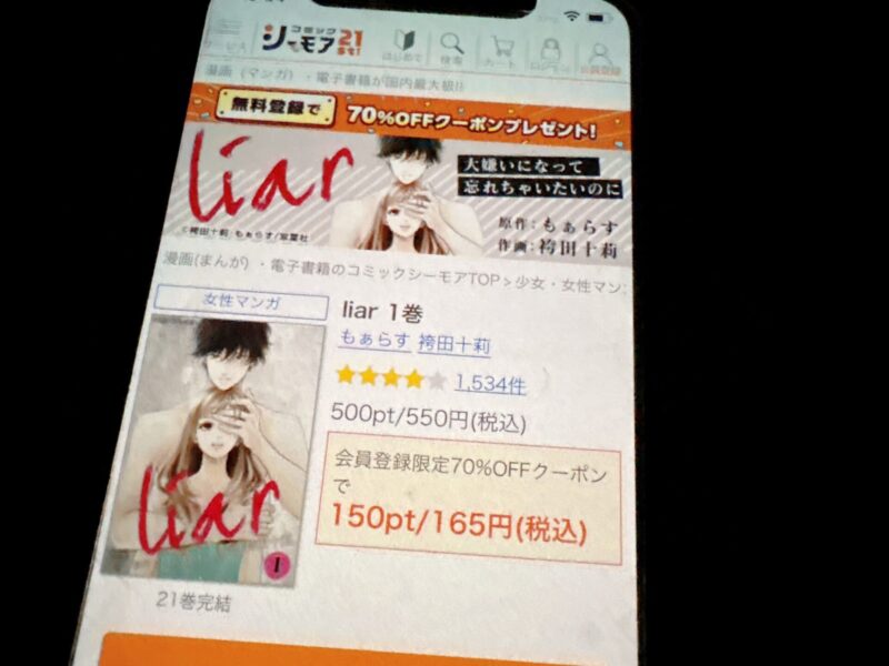 たとえばliar1巻(税込550円)を購入する場合、クーポン利用で165円(税込)で購入できます。